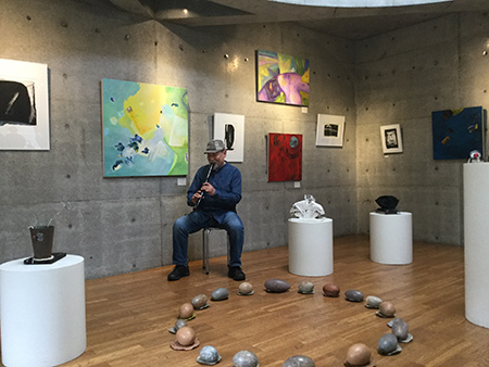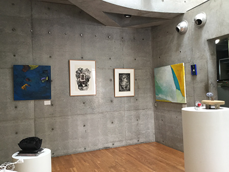 私は石の彫刻、ゴミを使ったゴミを減らすための立体作品、平面絵画、版画など制作しますが、今回は絵画とミクスドメディアの立体を展示しました。